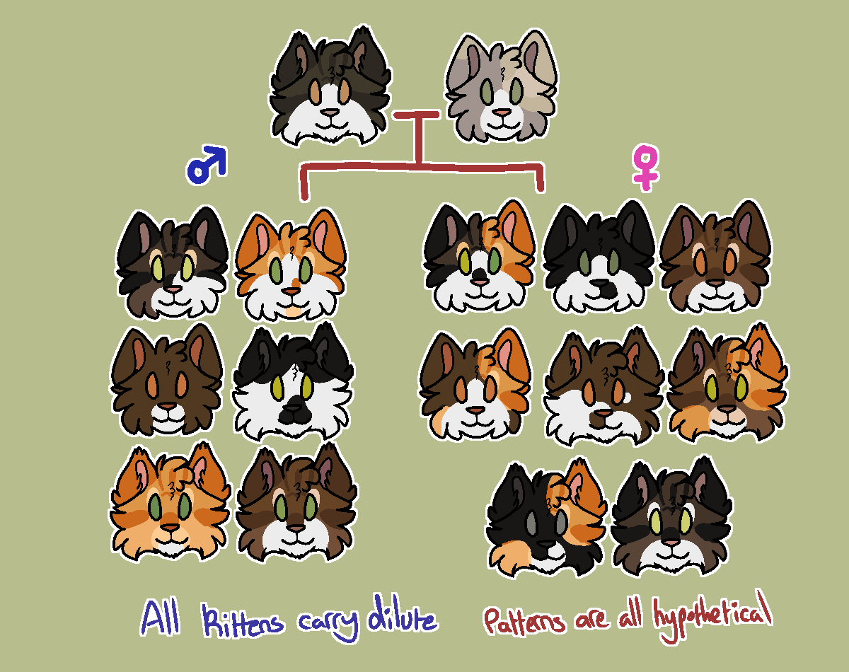Under the family tree it says in Blue "All kittens carry dilute" and in red it says "Patterns are all hypothetical"