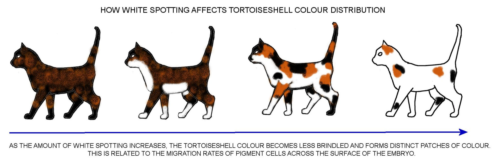 under the arrow is text saying "AS THE AMOUNT OF WHITE SPOTTING INCREASES, THE TORTOISESHELL COLOUR BECOMES LESS BRINGLED AND FORMS DISTINCT PATCHES OF COLOUR.